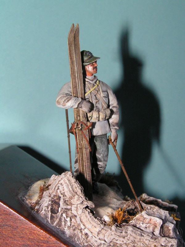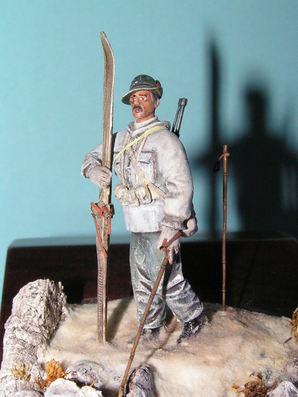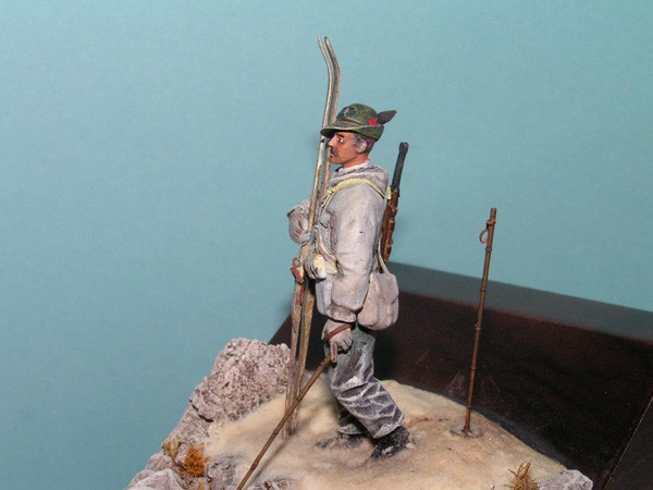 La tenuta da sciatore, sci compresi, è quella più accattivante, per la sua rarità, fra le diverse possibili per un alpino sul fronte russo, un aspetto moderno fra la massa degli altri reparti.