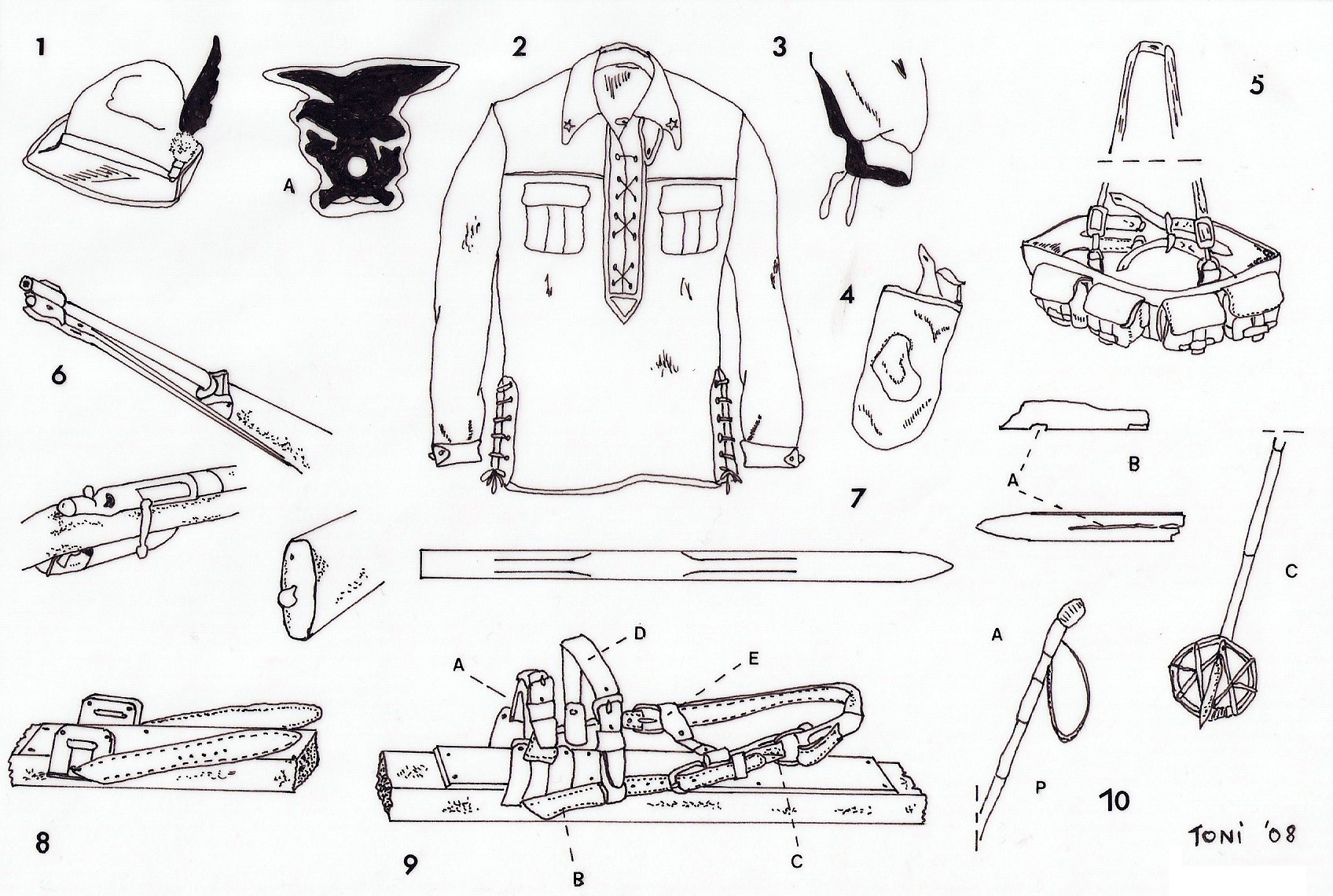 Sopra alla normale uniforme, caratterizzata però dai pantaloni 'da sciatore' s'indossava spesso solo un camiciotto impermeabile (2) in tela cerata bianca, fornito in tre taglie, con sparato a 7 occhielli per parte, sotto al quale c'era un'ampia pettorina triangolare a soffietto.
