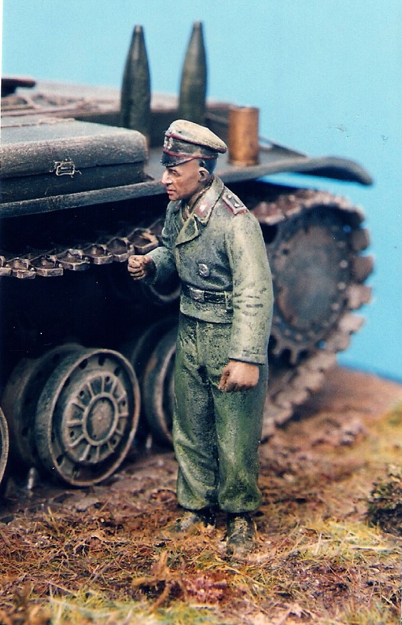Sono partito da un bel figurino della Hornet, non recente (inizi del 1997), quello contrassegnato dalla sigla GH 25, un pezzo senza fronzoli ma che potrà essere arricchito da alcuni effetti di verniciatura. L'alto standard di stampaggio e la posa già convincente non rendono necessario molto lavoro, se non portarlo allo standard della Wehrmacht per quanto riuarda mostreggiature ed insegne, anche nel cappello. Ho tolto anche la tasca sui pantaloni in alto a destra. Personalmente, mi trovo a mio agio usando i colori a smalto come base, valorizzandoli con colori ad olio. Gli smalti sino a qualche anno fa erano considerati colori adatti solo ai principianti, mentre regnava il colore ad olio con tutta una serie di accorgimenti e procedure veramente non alla portata di tutti. Alla fine, abbiamo tutti scoperto che fior di figurinisti, senza curarsi troppo delle varie mode, ancora li usano, e con quali risultati! In pratica, il colore ad olio è solo una velatura che aggiunge le sue particolarità ad un medium perfettamente coprente e questo in tempi ridotti, l'importante è stendere un buon primer, una pre-verniciatura in grigio medio, su tutto il pezzo. La tinta della pelle è imitabile, con più o meno fortuna – dipende da quanti più figurini portiamo a buon fine – con alcune miscele, che specie col crescere dell'esperienza ci verranno naturali e più pratiche rispetto ad un qualsiasi color 'rosa' già pronto. Su una miscela è anche vero che resta più facile partire per ottenere i vari chiaroscuri, si parte mescolando marrone, giallo e bianco, eventualmente scurendo con marrone rossiccio ma senza esagerare. La fase successiva, ad asciugatura avvenuta, è passare all'ombreggiatura, applicando un marrone prima sulla connessione del naso, poi sulla zona inferiore delle labbra, le orecchie e la zona delimitata dall'eventuale copricapo e la radice dei capelli.