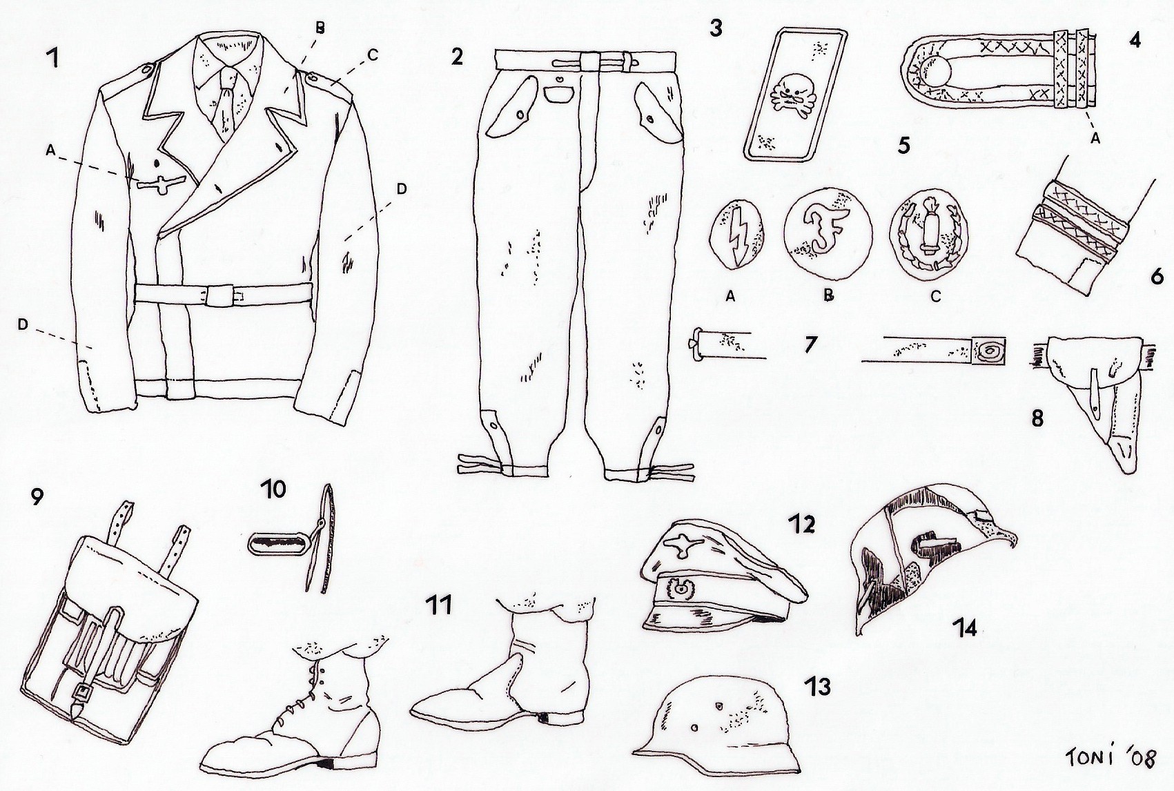 L'equipaggiamento, operando in spazi un po' angusti, era ridotto al minimo: il cinturone da truppa e sottufficiali (7) era alto 45 mm, in cuoio nero con fibbia metallica piatta, a volte ridipinta in verde. Le fondine da pistola erano di vario tipo, quello illustrato (8) è nero, per la Walther P38. I binocoli (9) erano portati senza contenitore, solo col pezzo che proteggeva le lenti. Il portamappe regolamentare (10) era nero ma ne esistevano di altre fogge, in cuoio marrone, erano comunque portati sul fianco destro. Gli scarponcini neri (11) erano ormai la norma, anche se resistevano gli stivali di cuoio nero (12) coi quali si era entrati in guerra. Come copricapi, inizialmente furono in dotazione dei baschi simili a quelli dei carristi ma in materiale feldgrau ed altrettanto poco pratici a bordo dei mezzi, furono presto abbandonati. La loro sparizione lasciò campo aperto a quasi tutti i tipi di copricapo in uso nell'esercito, il più vecchio disponibile era la bustina modello 38, in tessuto feldgrau. Del cappello a visiera da sottufficiale (9) esisteva un tipo precedente al 1936, simile ma molto più pratico e popolare, perché rispetto ad esso aveva cupola più piccola e floscia, mancava del soggolo e la visiera, nera o ricoperta di tela feldgrau, era morbida. I fregi – emblema nazionale sulla cupola e setto di foglie sulla banda, erano ricamati in filo d'alluminio argento o grigio-argento su verde scuro ed il waffenfarbe era applicato attorno alla cupola e sopra e sotto la banda. L'elmetto (13) era usato discontinuamente e dall'autunno 1943 non sarà più distribuito. Al modello 35, più curato e di colore verde, si poteva applicare la copertina mimetica reversibile – un lato era bianco, l'altro aveva la mimetica 'a pioggia' - (14), in tela a 5 spicchi con cucitura longitudinale ed asole per fissare fogliame.