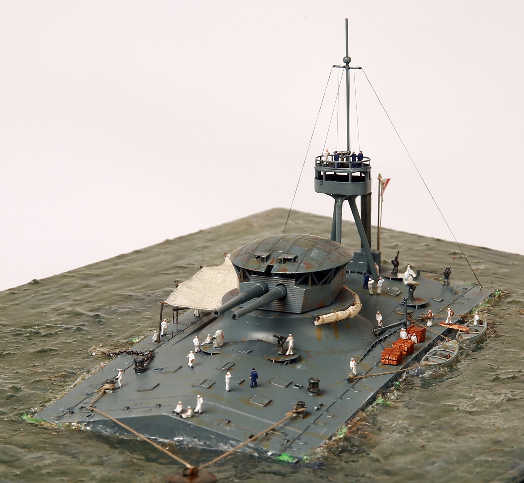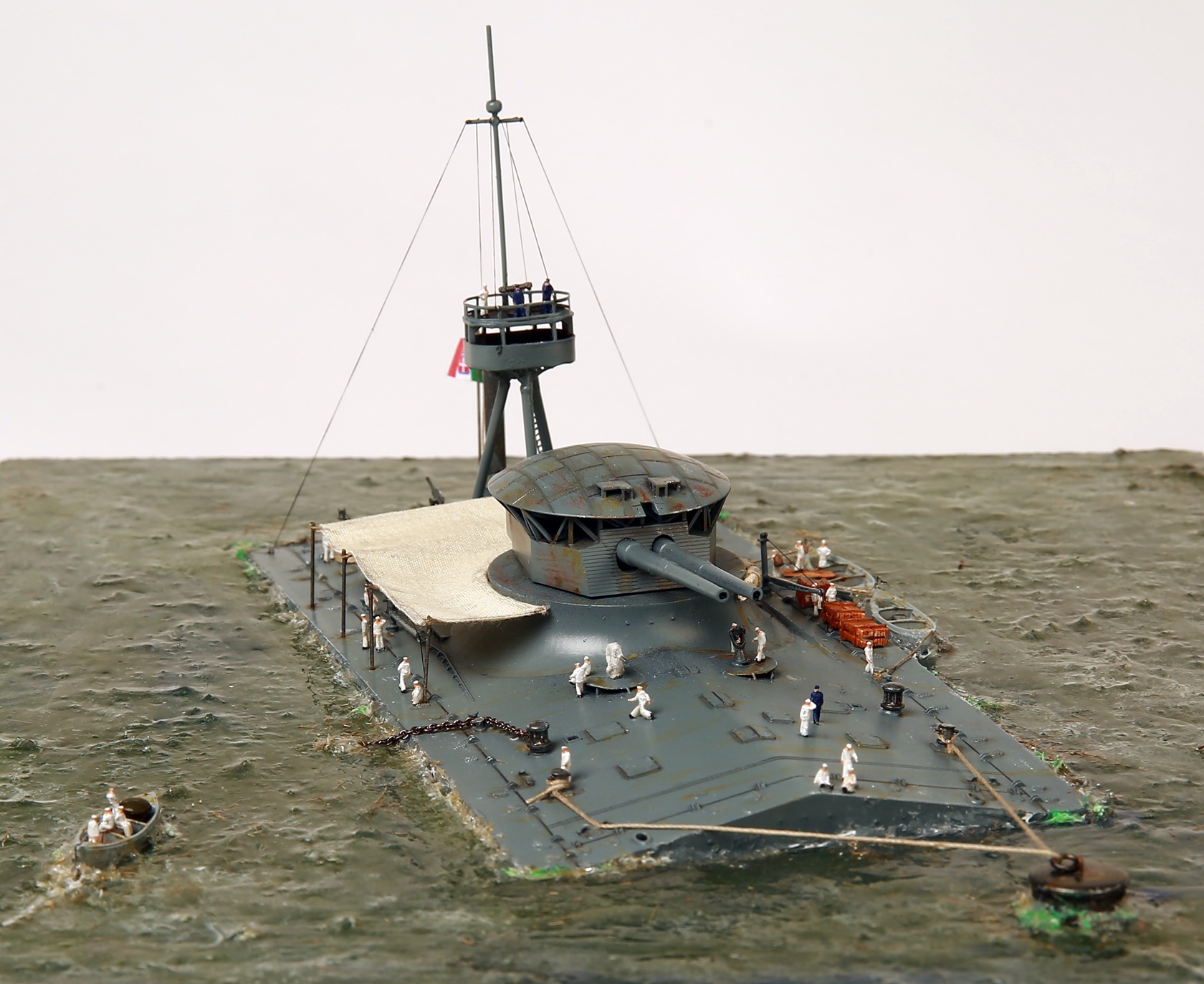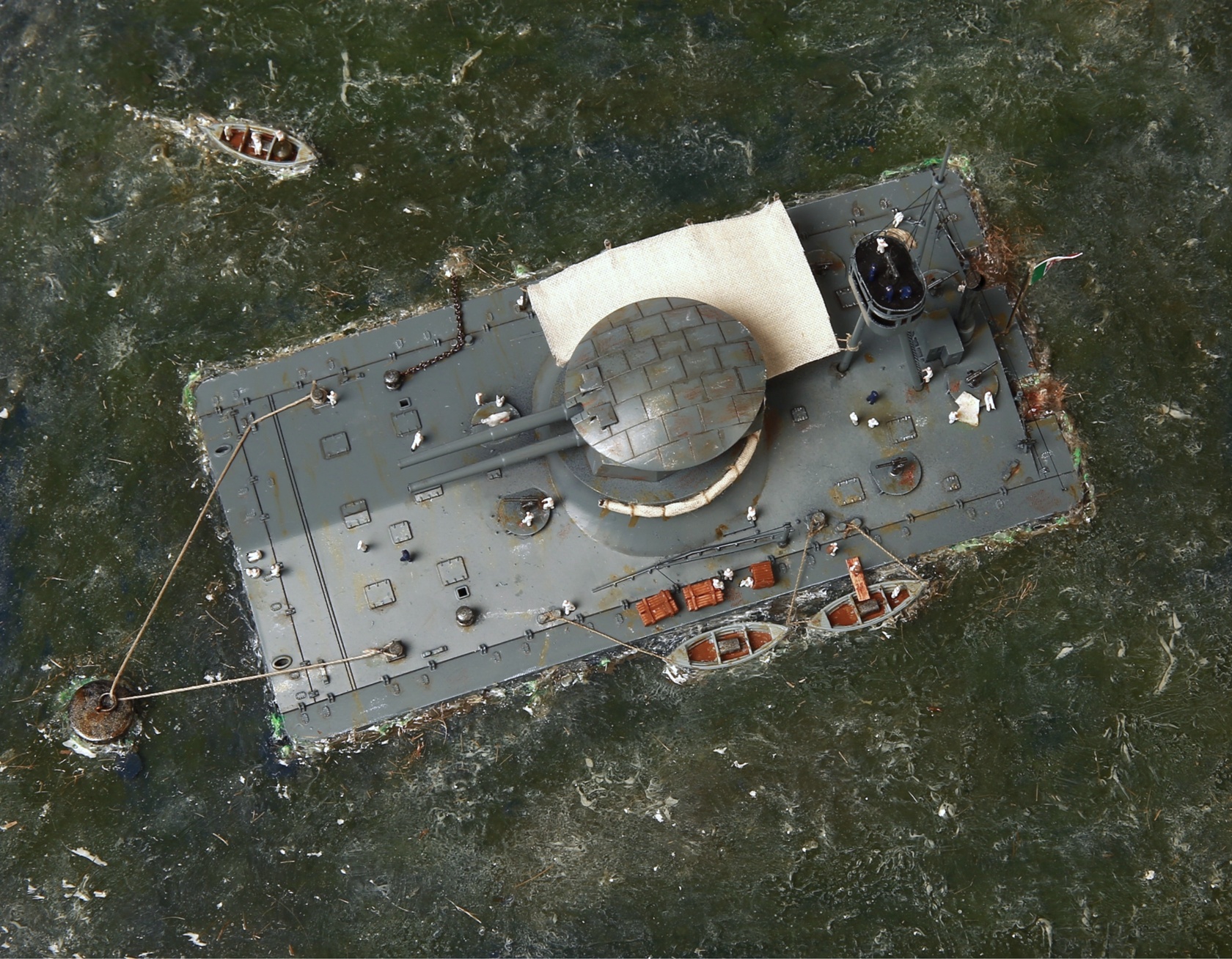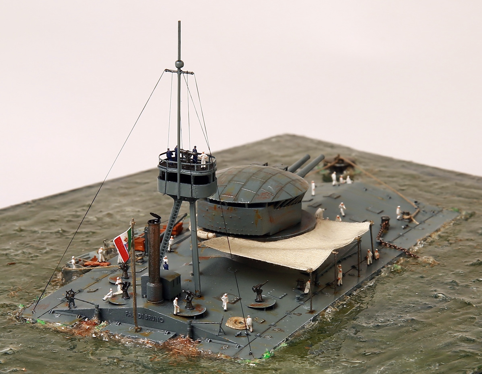 Come da foto storiche, ho aggiunto il dettaglio di un tendalino ricavato da una tela di cotone, in origine bianca ma invecchiata mettendola a mollo nel the; l'ho steso sul lato di dritta tra la torretta e alcuni montanti metallici a riparare una parte del ponte, mentre dall'altro lato della torretta l'ho posizionato solo arrotolato e legato.