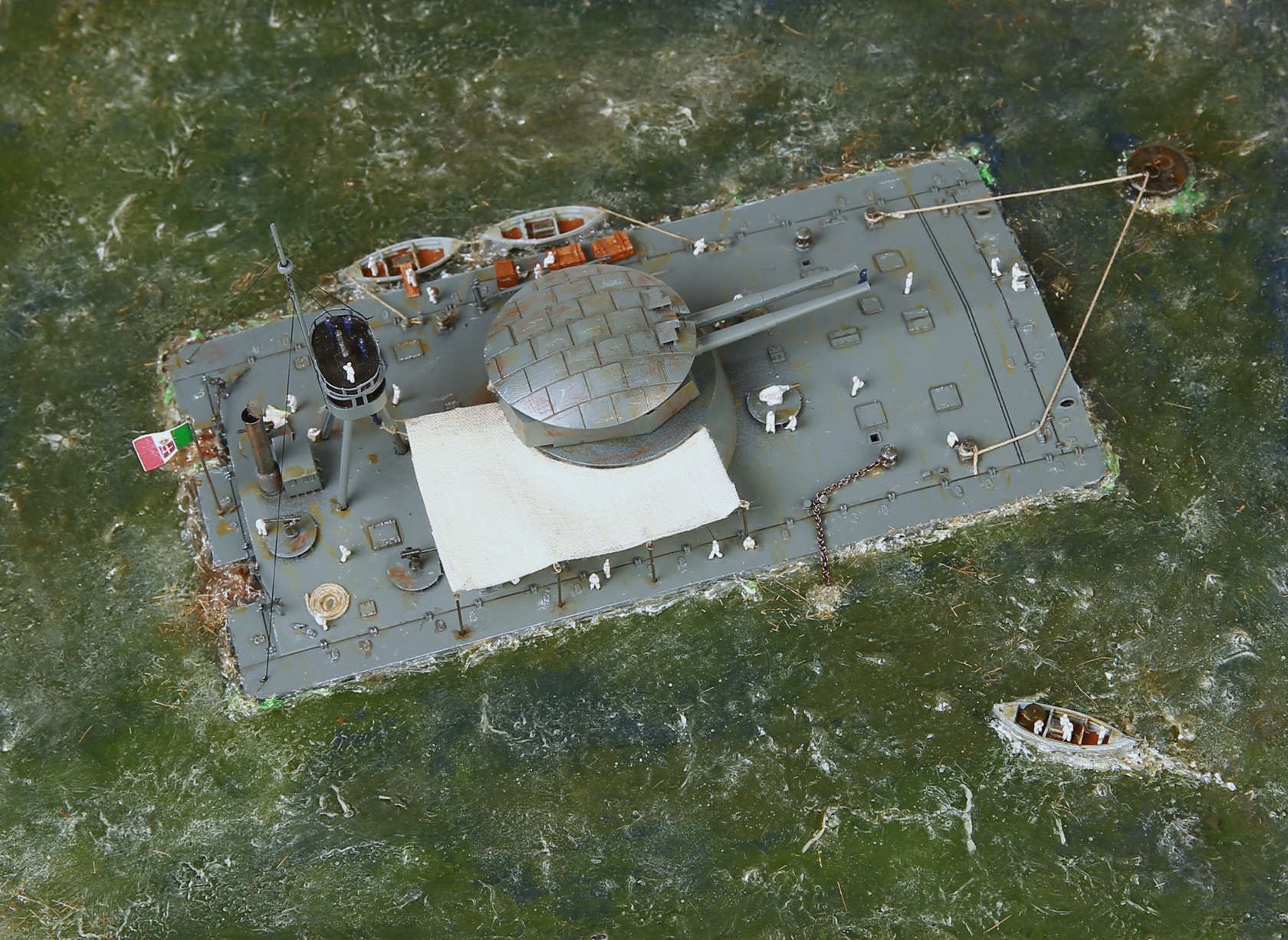 A completamento del diorama ho posizionato tre imbarcazioni in resina della francese L'Arsenal, una grossa boa di ormeggio ricavata con materiale del mio archivio, alcune casse della polacca Niko Model, una passerella in legno, del cordame e una catena per ancoraggio.
