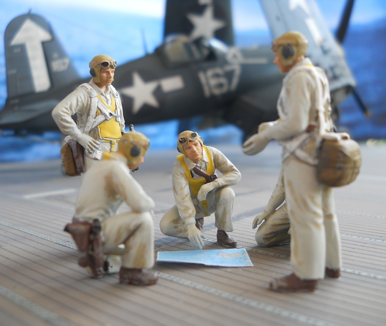 Inizialmente sono partito con il volerne fare uno con le insegne del Maj. Boyington (recuperate dal kit Academy), ma quando ho visto la fattura dello stampo e la possibilità di realizzarlo con le ali ripiegate sul ponte di una portaerei ho voluto esagerare e ne ho acquistato un altro che raffigura il Corsair del Lt. Cdr. Roger R. Hedrick, asso con un totale di 12 vittorie e 4 aerei danneggiati, ambientato sul ponte della USS Bunker Hill, con marinai, trattore e piloti che studiano una cartina con il loro comandante (da qui il titolo "Briefing sul ponte").