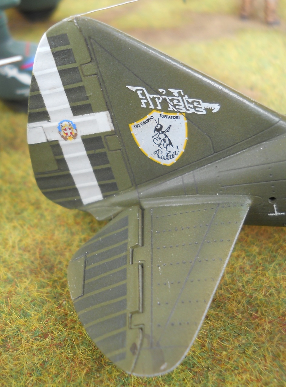Entrambe le fasce bianche di fusoliera sono state realizzate ad aerografo con bianco H34, come pure le croci del Re, in quanto le decal di scatola erano assolutamente sottomisura, le insegne sabaude sono state recuperate dal "magazzino"; anche sulle croci è stato simulato l'effetto tela aggiungendo una goccia di nero al bianco.