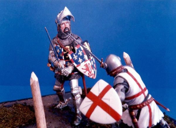 Avendo da sempre la passione per le figure storiche di questo periodo, non potevo certo esimermi dal farlo, ed ho realizzato questa scenetta utilizzando due splendide sculture da 90mm che raffigurano un cavaliere inglese che attacca con ardore “Antoine Duc de Brabant et de Limbourg”.