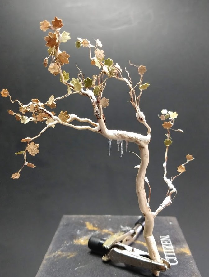 La neve ghiacciata è realizzata con gel vetrificante mescolato a bicarbonato di sodio e poi inserita con pennellino nei punti giusti.