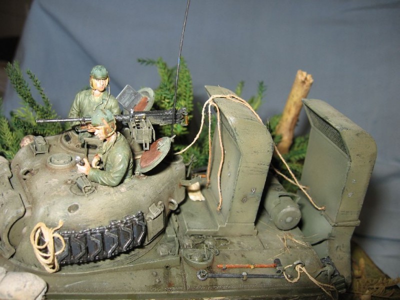 Per la scenetta ho usato tre figurini della Dragon dedicati ai Marines impiegati a Tarawa; due li ho trasformati in carristi cambiando le teste usando quelle della Hornet dei carristi Usa, l'altro, inginocchiato con il lanciafiamme, è stato arricchito con delle cinghie realizzate con strisce di lamierino; anche a questo figurino ho cambiato la testa (sempre con un'altra della Hornet).