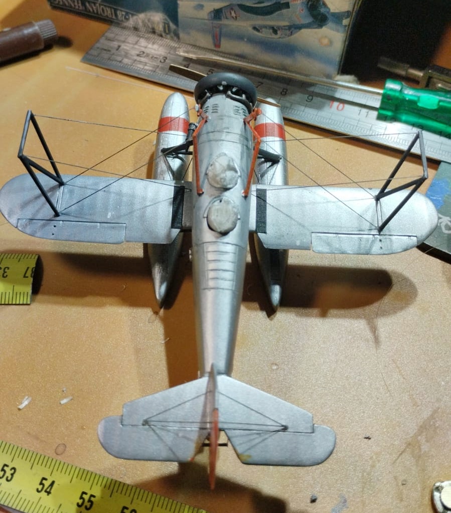 Il motore è discreto, con un accenno di cofanatura tipo NACA. Gli scarichi, invece, sono risultati particolarmente problematici: poco definiti, con istruzioni carenti (una costante lungo tutto il montaggio) e posizionamento lasciato quasi all'interpretazione. Anche i galleggianti sono privi di riferimenti precisi; nonostante l'aggiunta di pesi interni, il modello risultava sbilanciato, costringendomi a realizzare un supporto “di fantasia” per mantenerlo in assetto. Pur non essendo fedele all'originale, svolge bene la sua funzione senza distrarre eccessivamente.