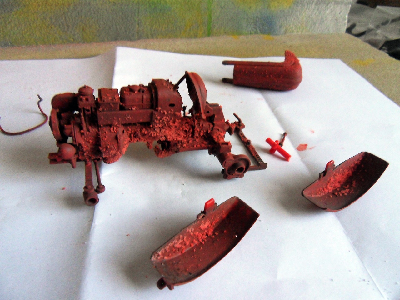 Io ho dato un fondo di ruggine scura con gli smalti, ho applicato sale fino con acqua, spruzzato rosso acrilico Vallejo e poi tolto il sale si ottiene un bell’effetto di vernice scrostata e usurata.