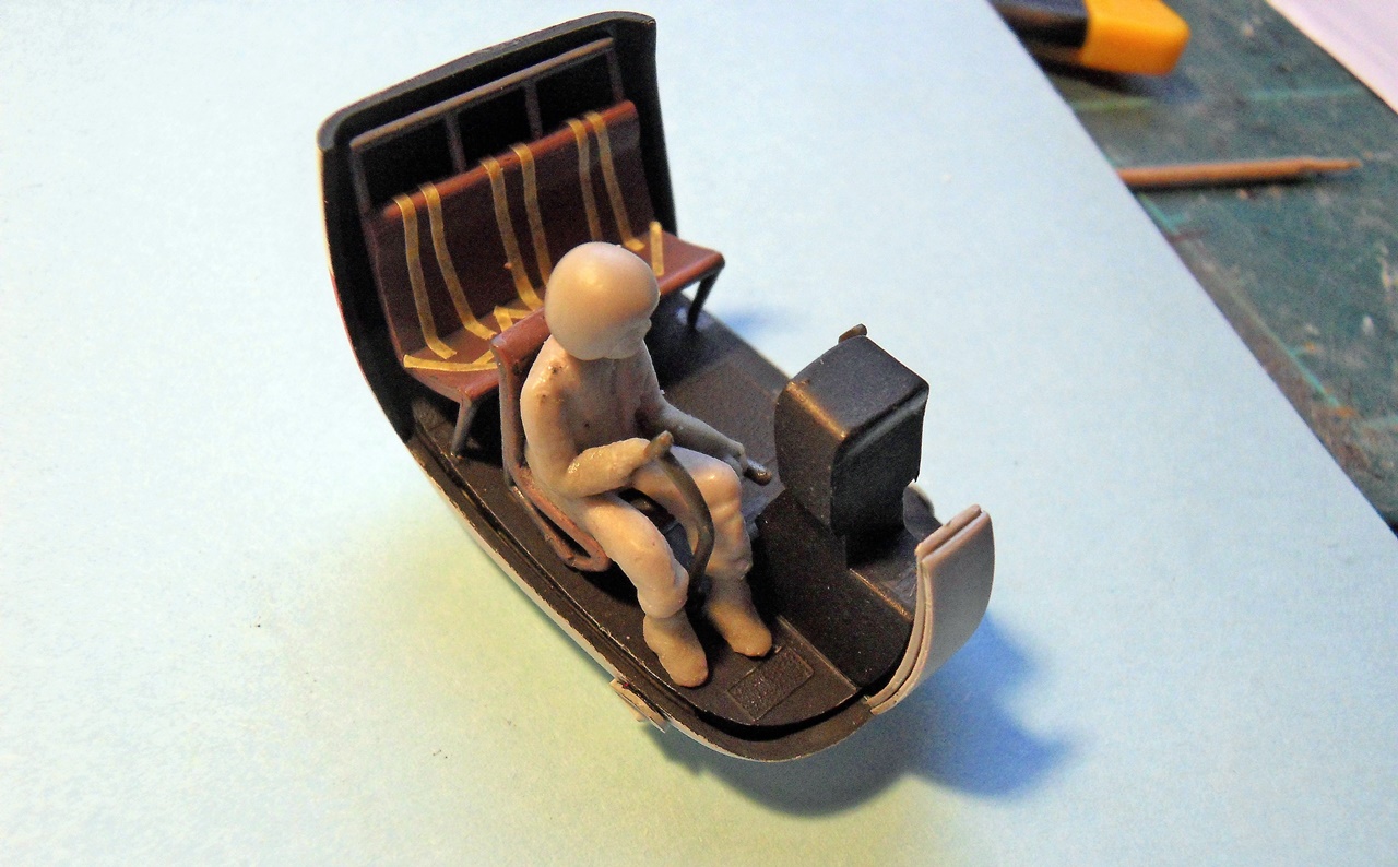 Nell’abitacolo ho rifatto il cruscotto e le cinture dei sedili con nastro TAMIYA e alluminio adesivo per le fibbie.