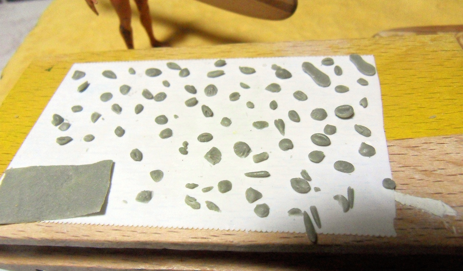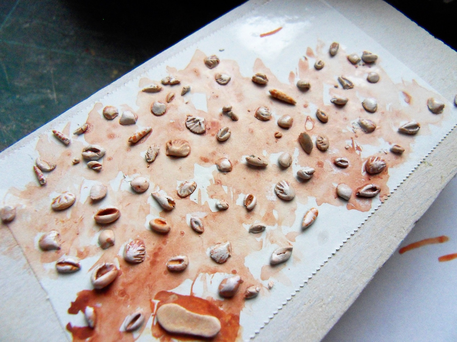 La base è stata sagomata su polistirolo isolante denso a cui ho dato una trama da 'spiaggia' premendo la superfice con le dita, il manico di un cacciavite e il fondo di una matita.