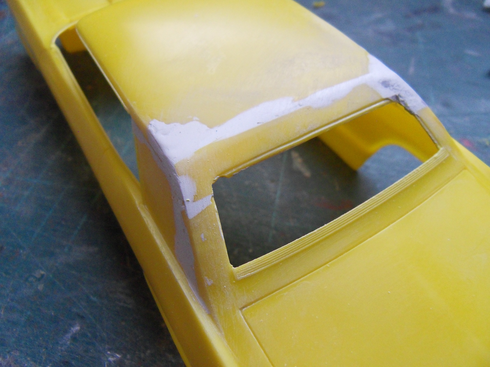Uno strip di plasticard rivestito di alluminio adesivo simula il montante anteriore, mancano dei PIN STRIPES o linee di finitura caratteristiche delle auto di questa officina, forse un giorno...