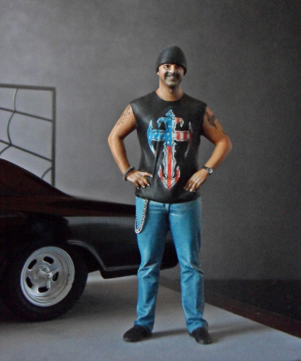 Lui è caratterizzato dalla Bandana e dalla maglietta con la croce che è il logo del suo negozio. La croce è anche il tatuaggio su braccio sinistro.