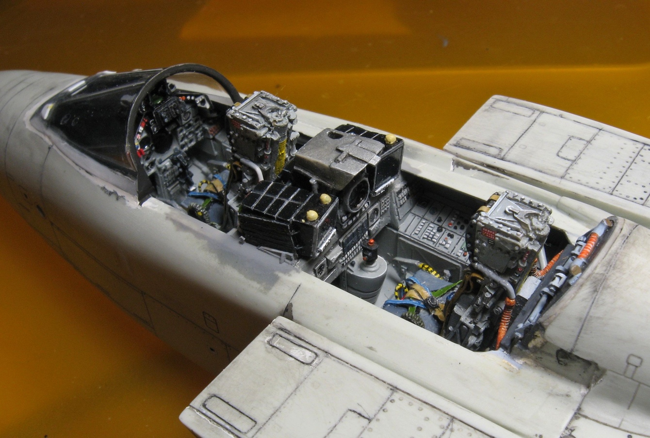 Non ho approfondito l'argomento più di tanto, ma mi pare che il vano aerofreni, nel corso degli anni abbia cambiato aspetto, essendo state modificate le carenature che lo chiudono. Anche qui c'è poco da dire, le foto parlano da sole, ho asportato i particolari riprodotti in rilievo sul fondo, forato le pareti laterali e riprodotto con materiali vari tubazioni rigide e flessibili.